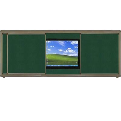 ⒊ 支持電子白板獨(dú)立安裝使用,電子白板易維護(hù)性好。外框內(nèi)預(yù)留了電子白板USB線和投影機(jī)VGA線路由出口,方便多媒體布線。前邊的活動(dòng)綠板向右推拉展開,露出電子白板,供教師多媒體互動(dòng)教學(xué)使用,閉合綠板后,可以將其鎖閉,有效保護(hù)電子白板。